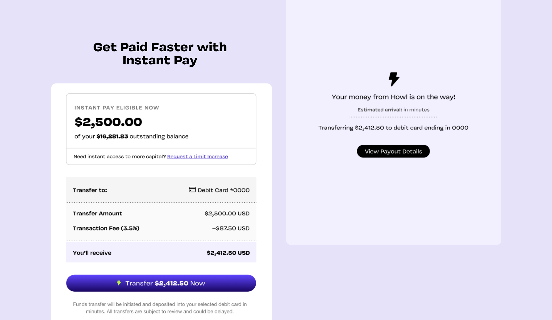 Howl is a marketplace where commerce creators team up with brands and earn income. Since many creators are self-funded, having quick access to cash is essential to keep their businesses running. Traditional affiliate platforms paid out net 30-90, which created financial strain. To support our creators, Howl launched Instant Pay, giving our users the ability to deposit their earnings with just one click.